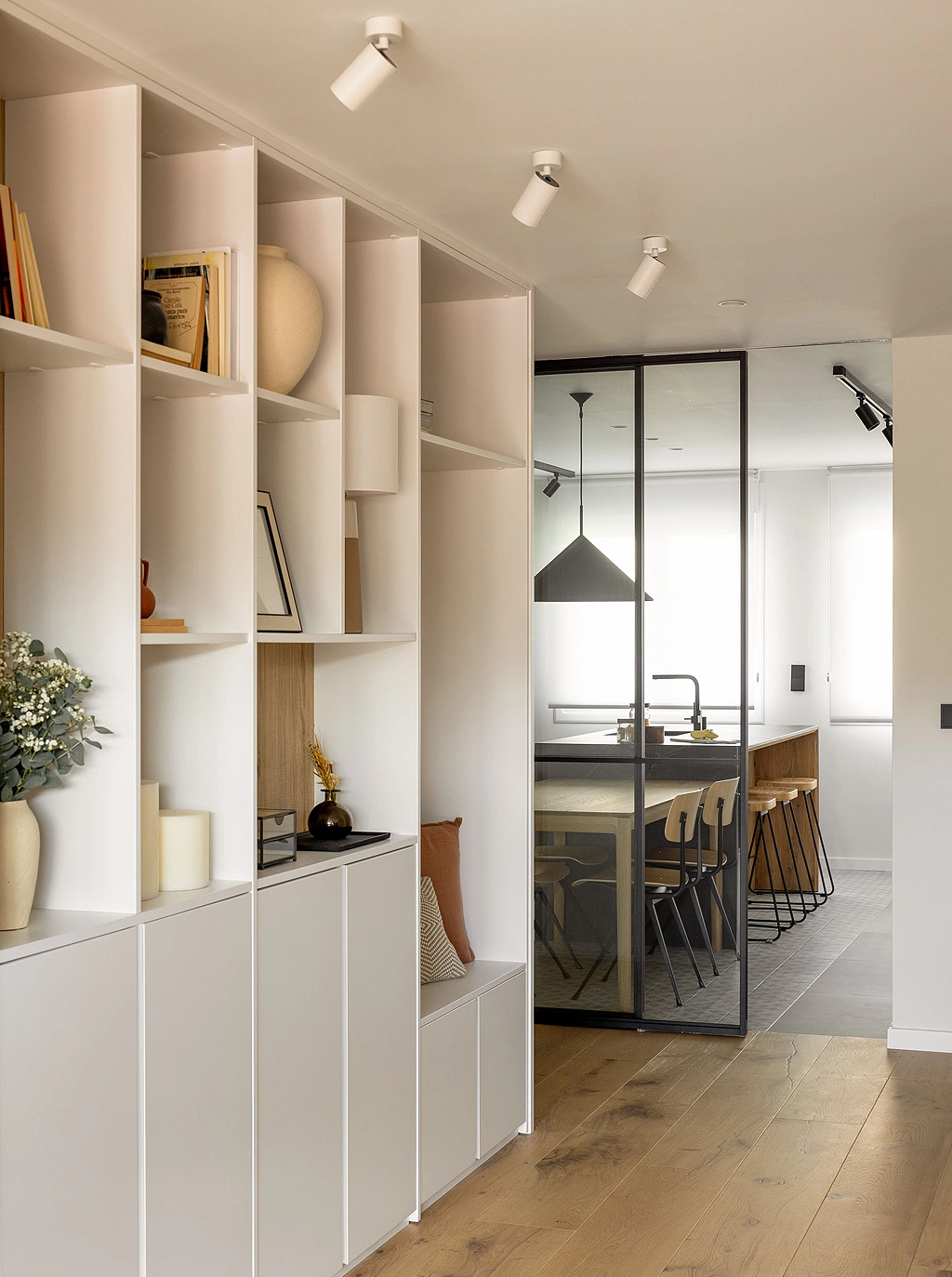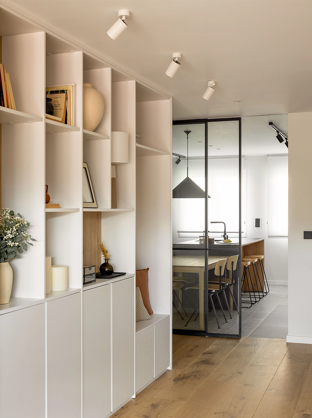 Optamos por derribar todos los tabiques que compartimentaban la zona de día, permitiendo el paso de luz a lo largo de la vivienda. En su lugar, diseñamos un módulo central capaz de delimitar los recorridos y separar ambientes a la vez que acoge la función de estantería y armario.