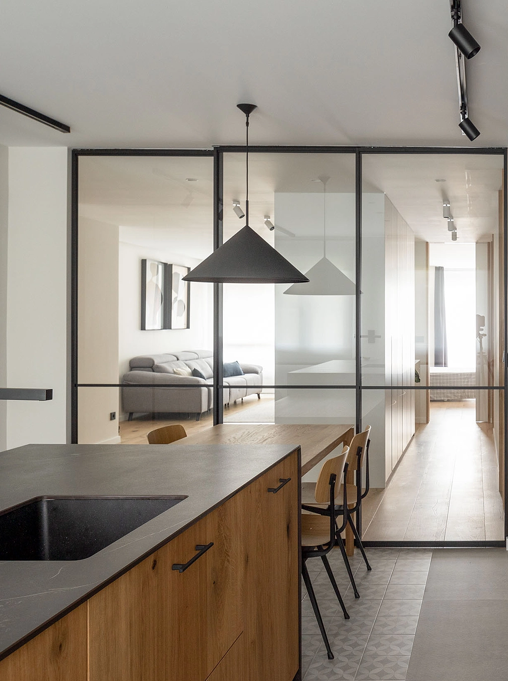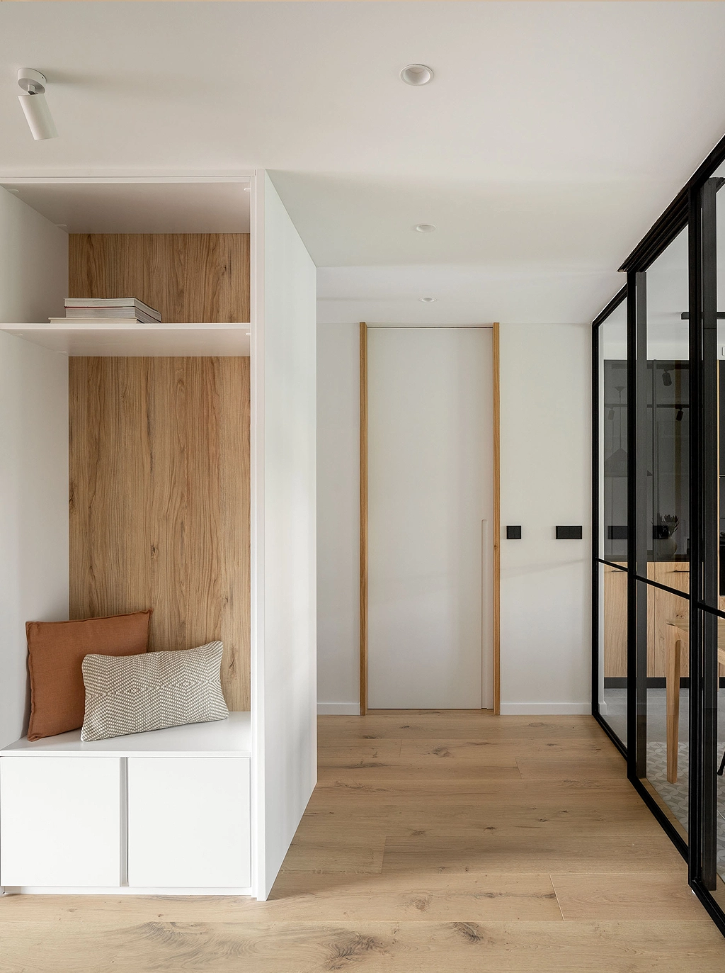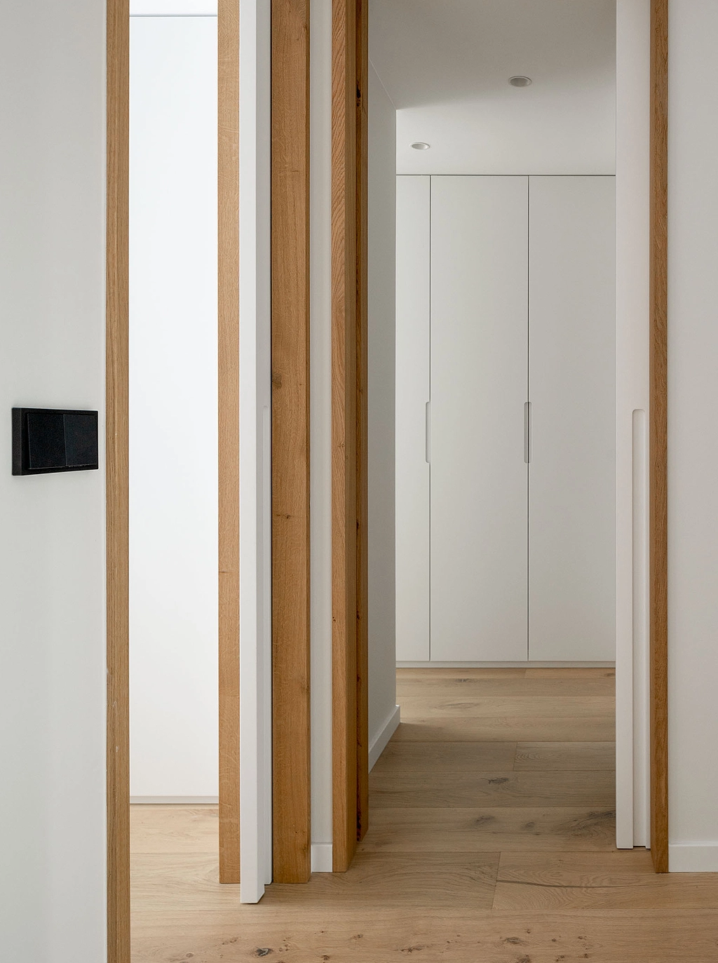Las puertas de suelo a techo enmarcadas por unas finas jambas de roble natural, las convierten en el sutil protagonista de este proyecto.