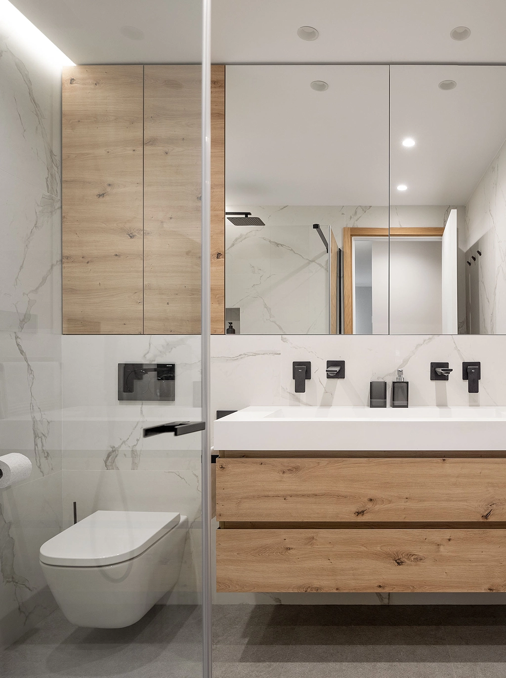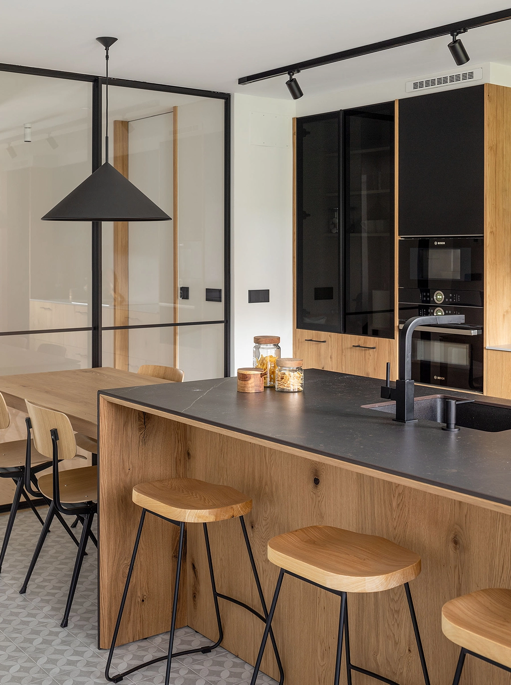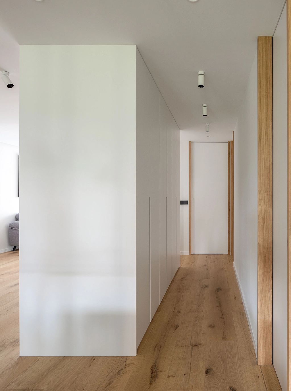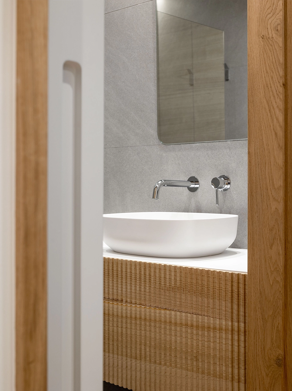Las puertas de suelo a techo enmarcadas por unas finas jambas de roble natural, las convierten en el sutil protagonista de este proyecto.