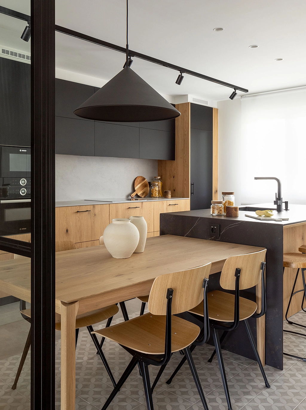 La cocina se abre paso a través de un cerramiento industrial y se desarrolla alrededor de una isla revestida en Dekton Keyla natural que reúne la zona de agua.