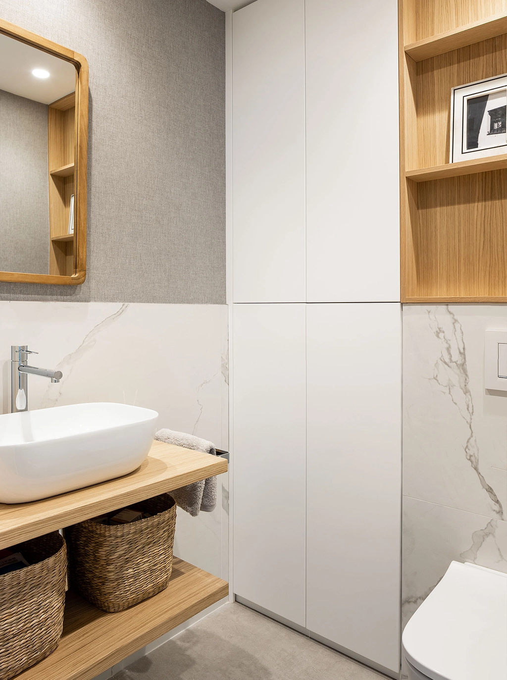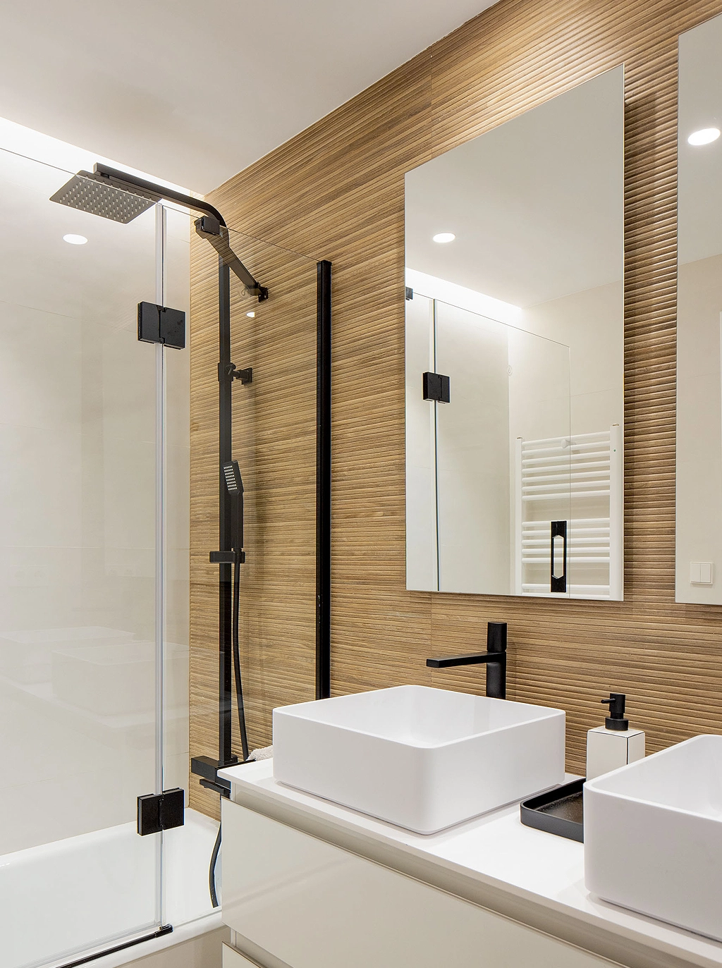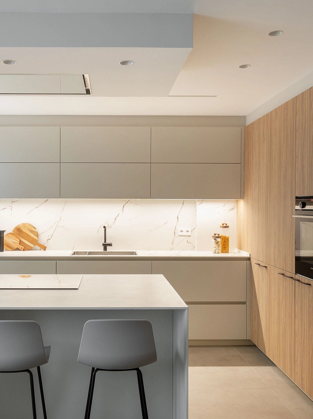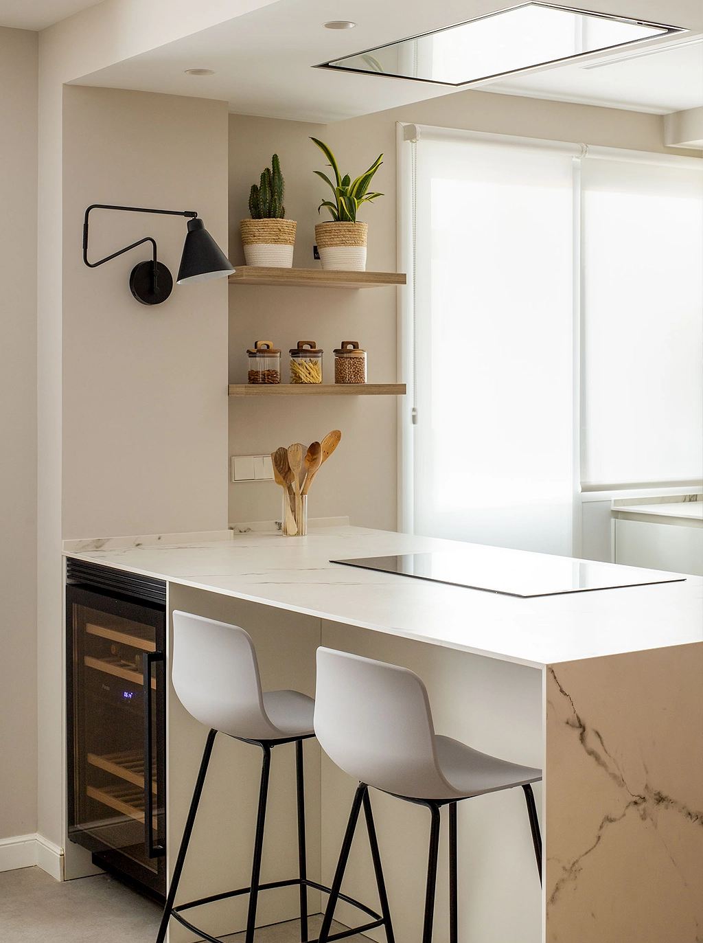Los tonos escogidos en blanco perla y madera, aportan calma y atemporalidad al espacio.