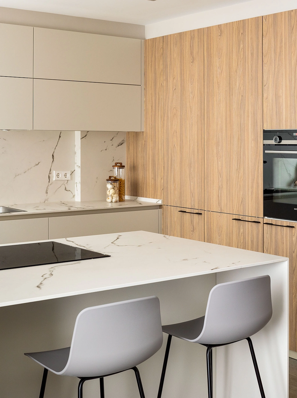 En la cocina, optamos por colocar la zona de cocción junto con la barra de desayuno en una península.
