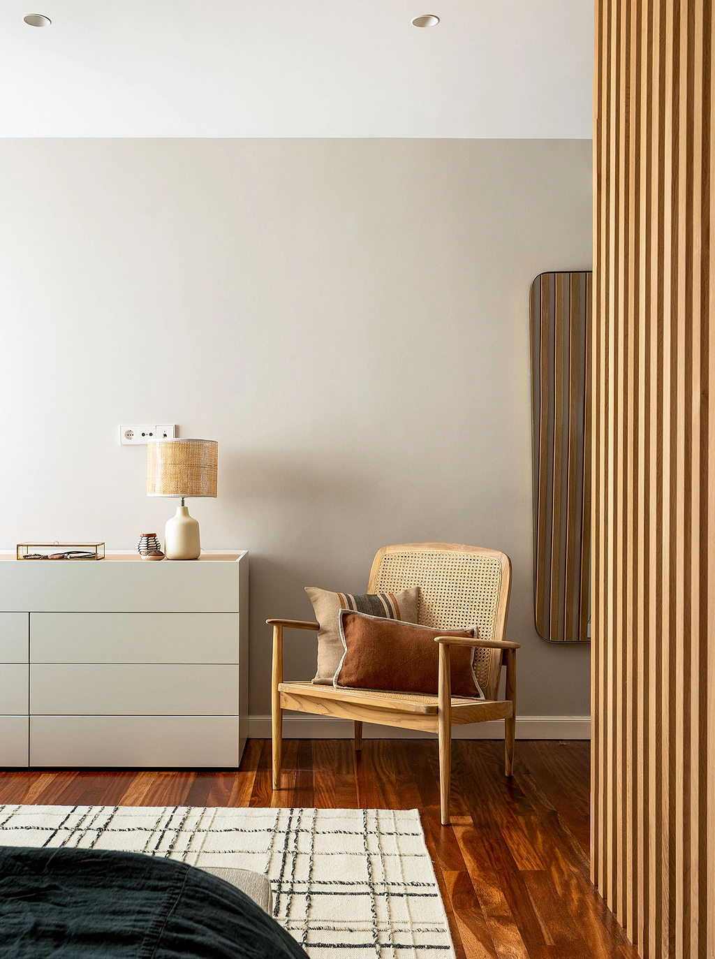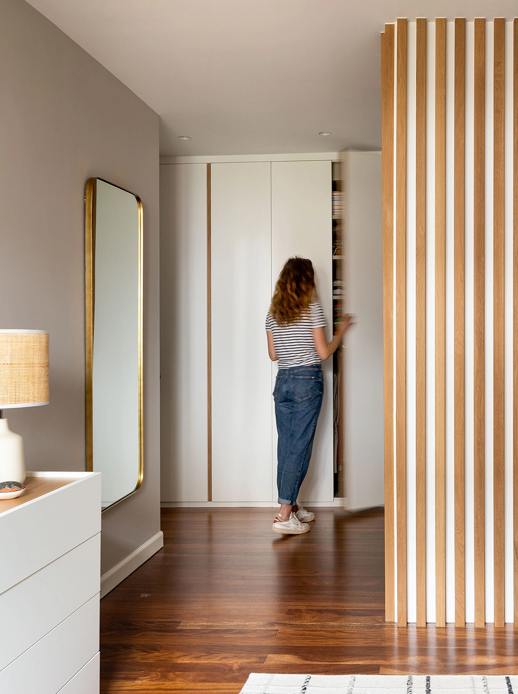 En el dormitorio principal los listones de madera de roble de suelo a techo son los protagonistas indiscutibles. Diseñados e integrados dentro de los diferentes elementos que componen este espacio, dotan al conjunto de uniformidad y personalidad.