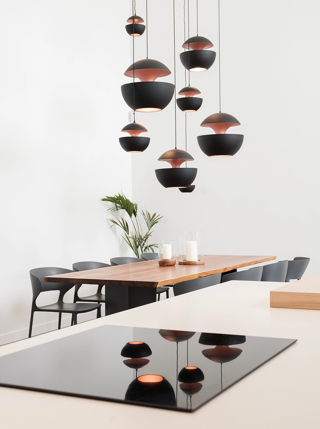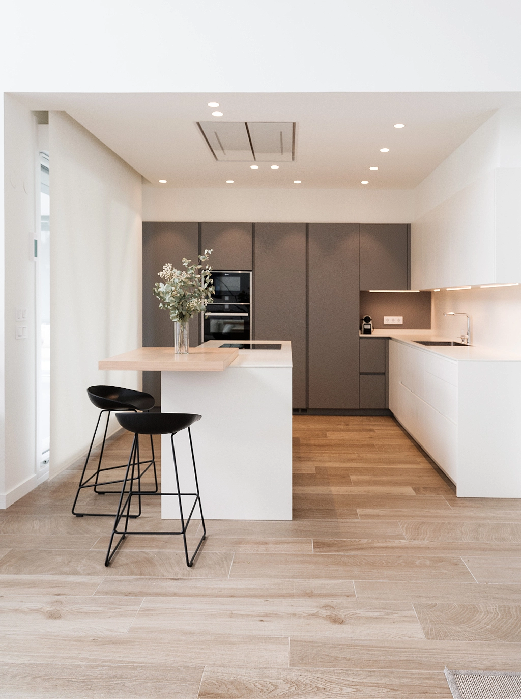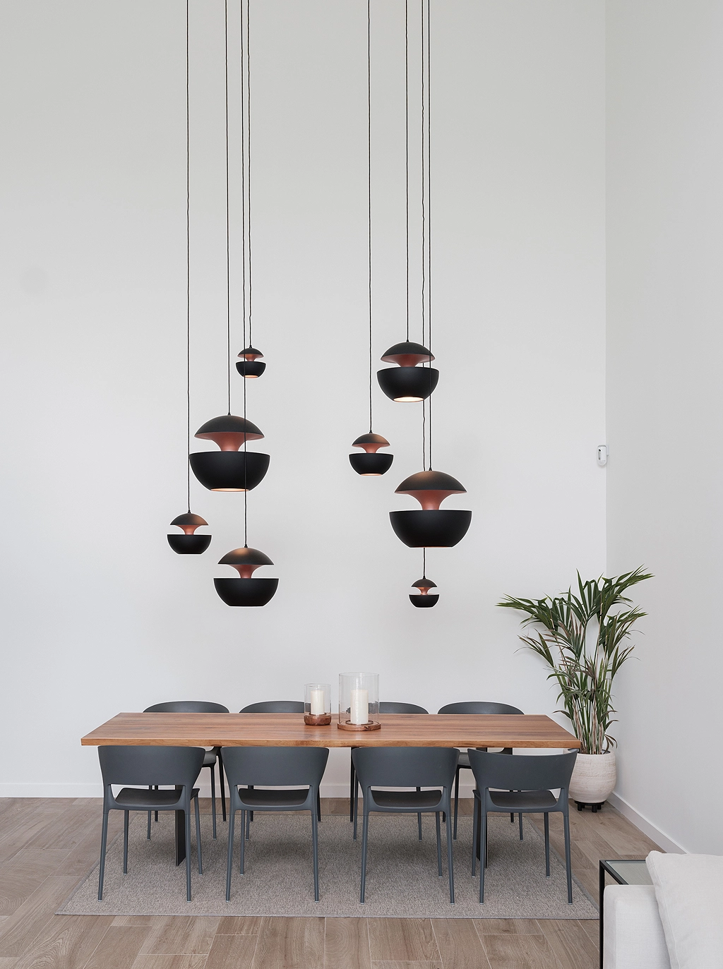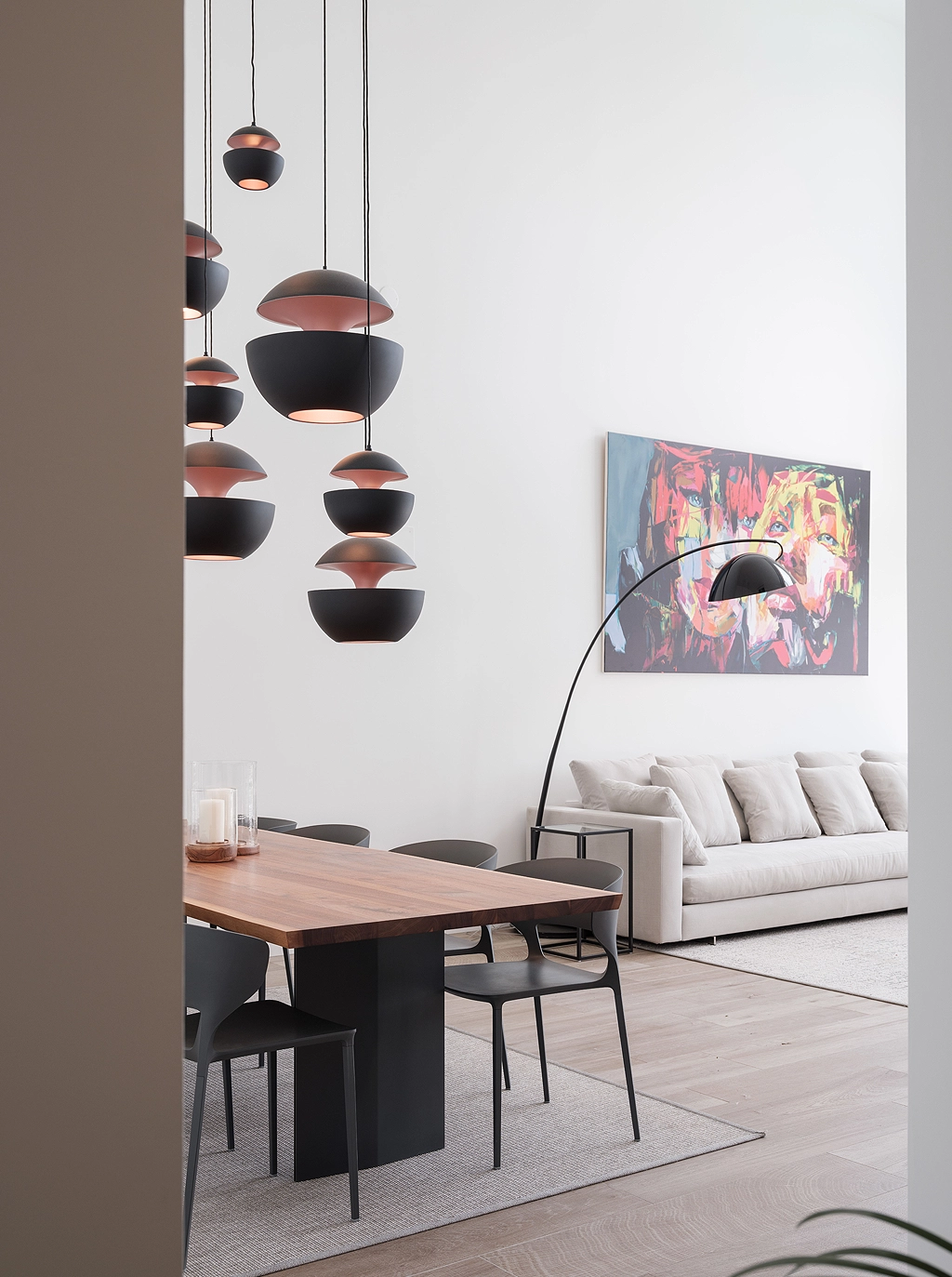 La cocina se resuelve con dos acabados – gris y blanco- y una isla que marca los límites de esta. Sin duda, la mesa de nogal es la protagonista de este espacio, con grandes dimensiones, bordes naturales y una base en hierro. Para romper con el matiz rústico de la madera maciza, se decide combinar con unas sillas de poliuretano en gris antracita. El conjunto queda enmarcado por de lámparas colgantes DCW. Escogidas de diferente diámetro y colocadas a distinta altura, confieren ritmo y dinamismo al comedor.
