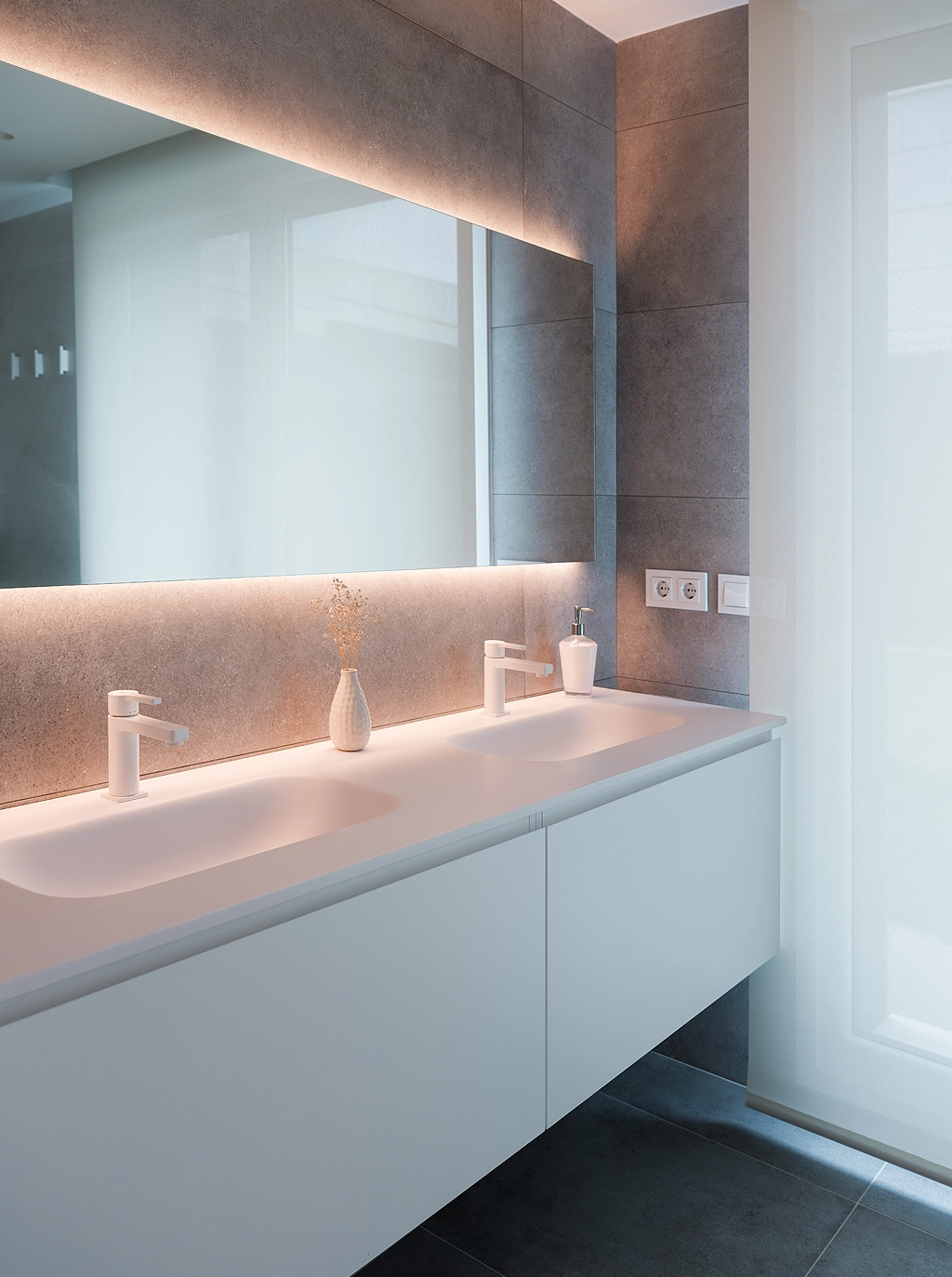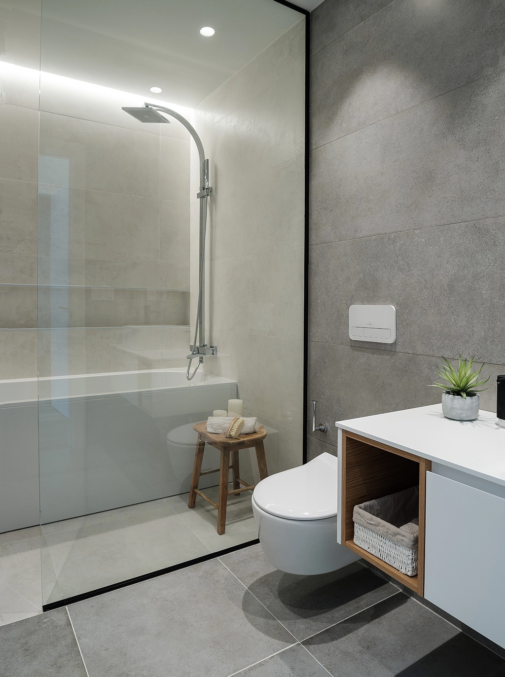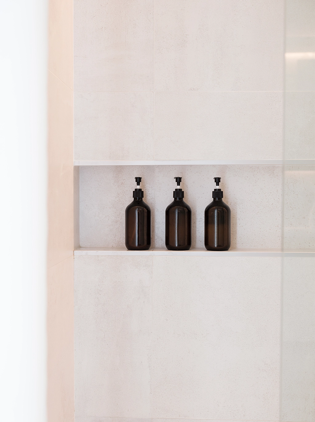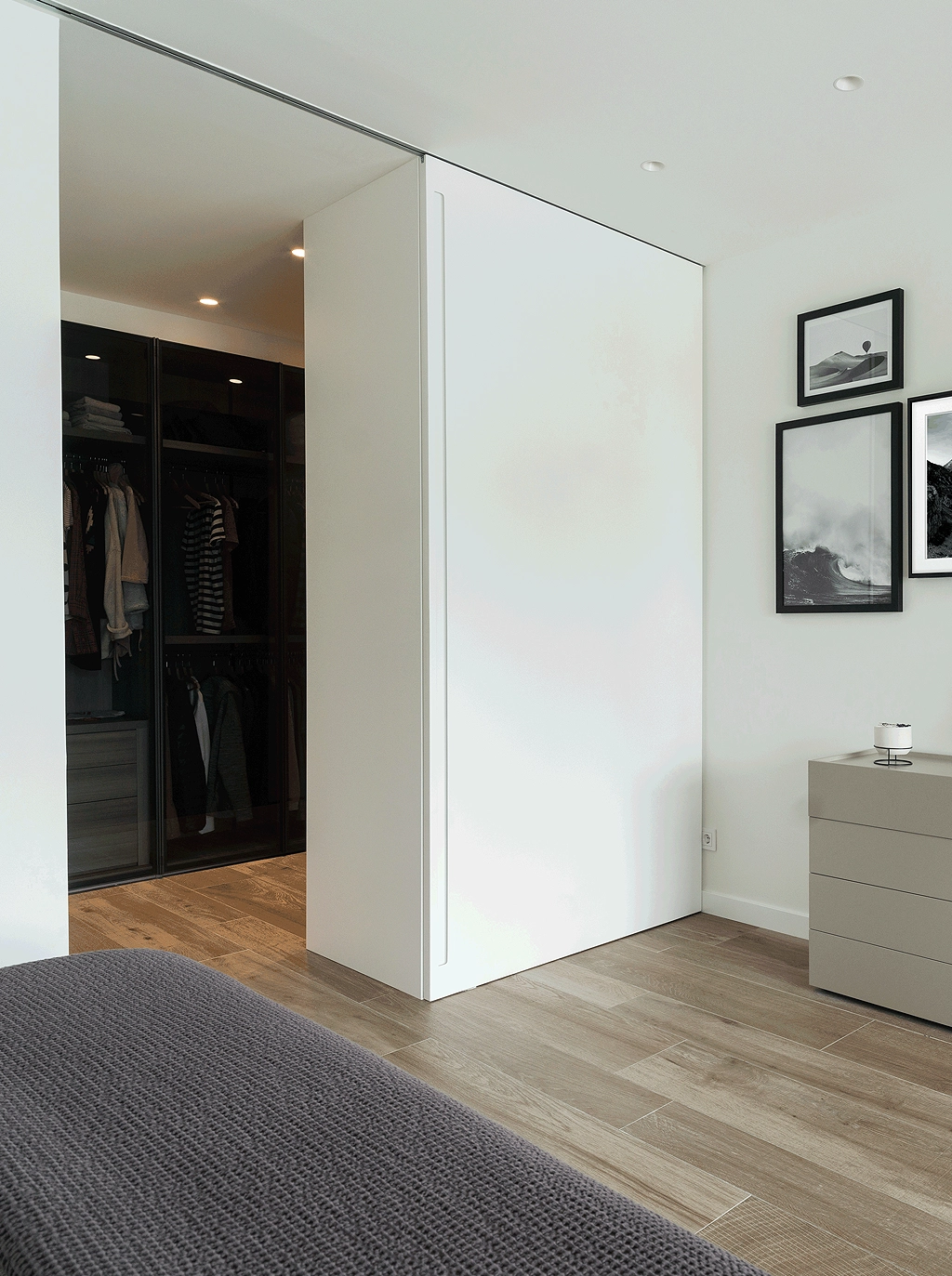 Las zonas privadas, -dormitorios y baños- continúan con colores blancos y los tonos neutros como eje principal. Desde el vestidor con puertas de vidrio ahumadas se accede al dormitorio principal a través de una puerta pensada y diseñada para quedar totalmente integrada en el paño de la pared.