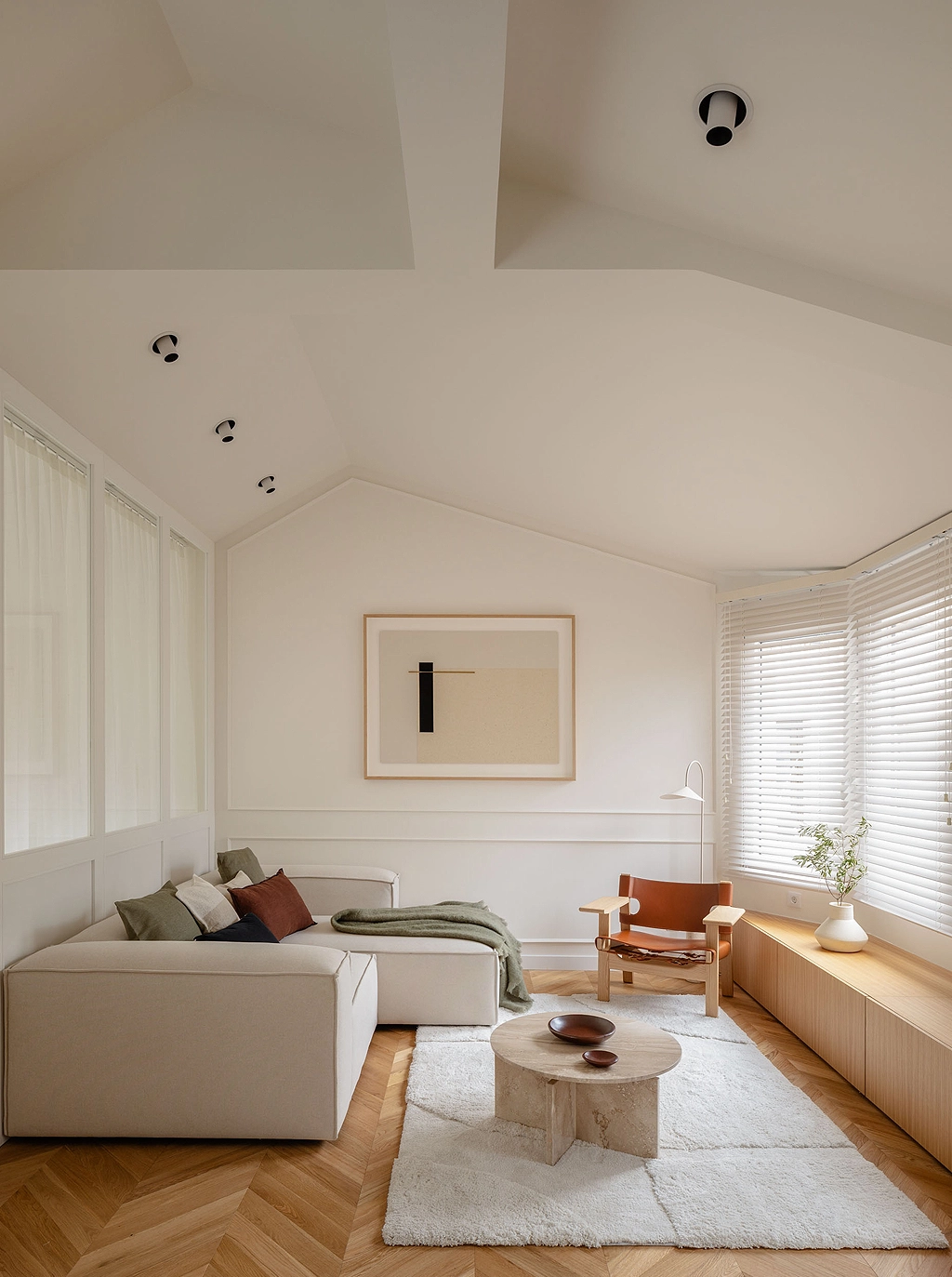 Aprovechando el potencial de la cubierta inclinada, el salón queda enmarcado por la propia arquitectura y las molduras de las paredes, confiriéndole al espacio un estilo clásico renovado.