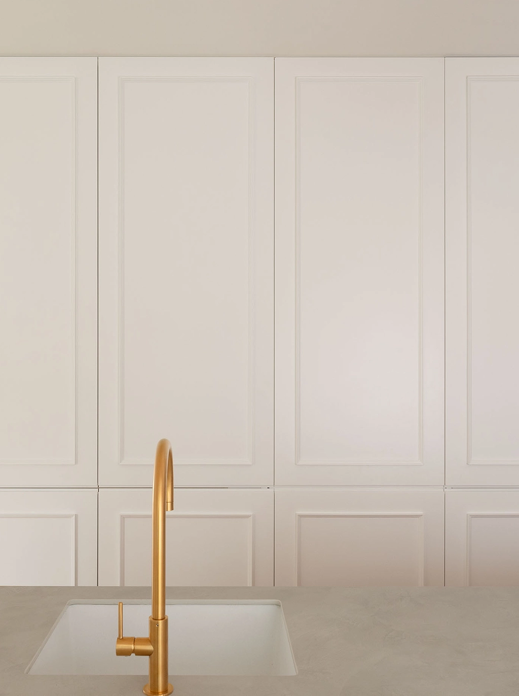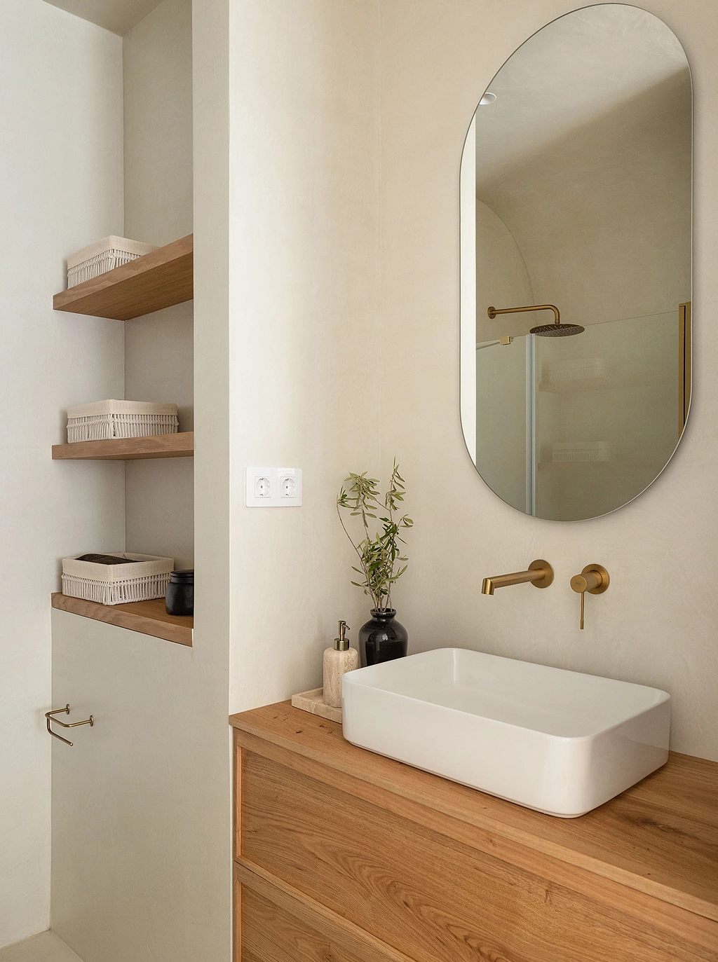 Revestido de microcemento y combinado con un mueble de madera natural y grifería en acabado oro bruñido, este baño se convierte en todo un pequeño oasis urbano.