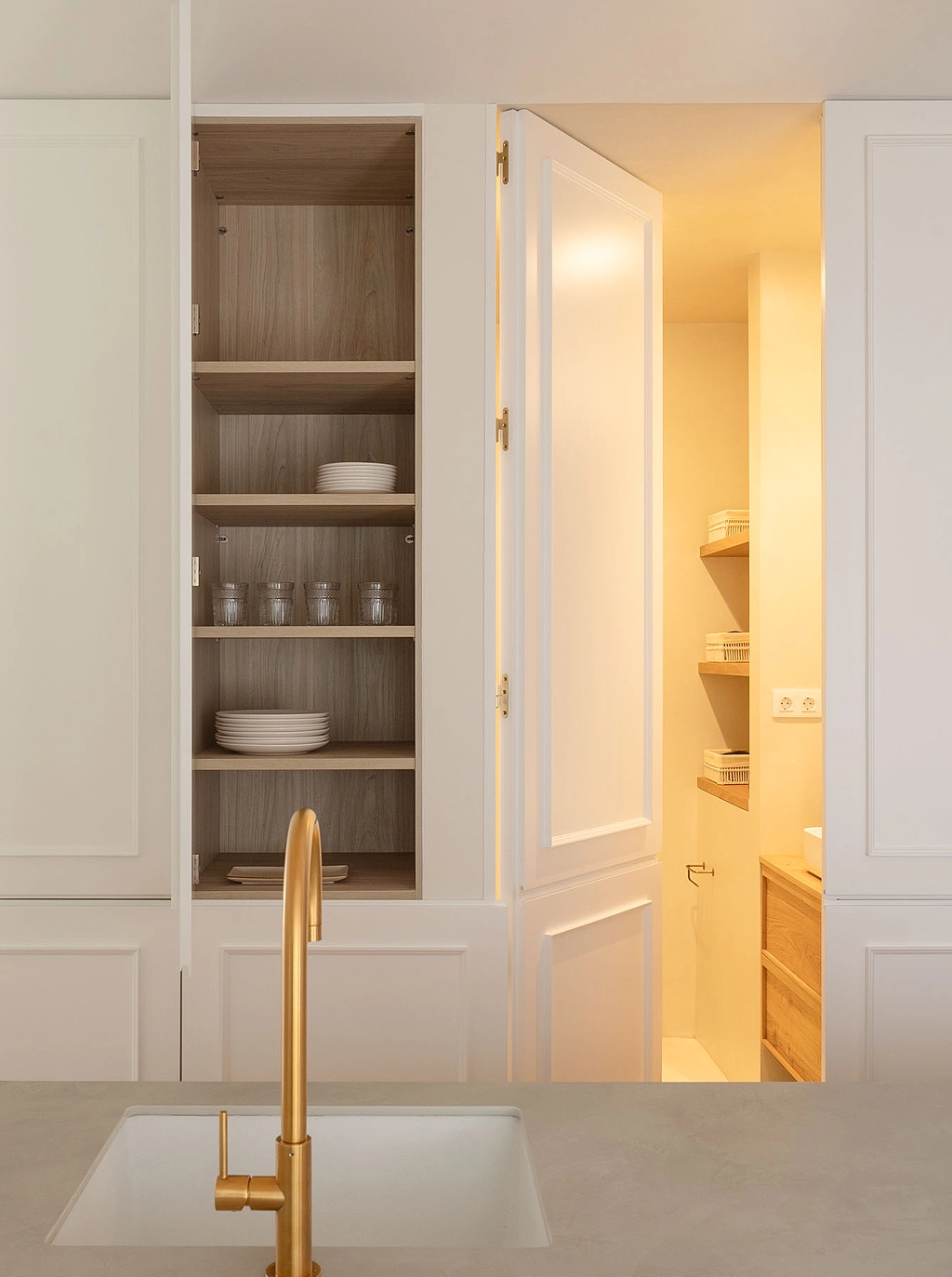 Tras la cocina, una pared panelada se fusiona con la estética general del apartamento. Oculta tras sus puertas, encontramos espacio de almacenaje, un desayunador y el secreto mejor guardado: un cuarto de baño.