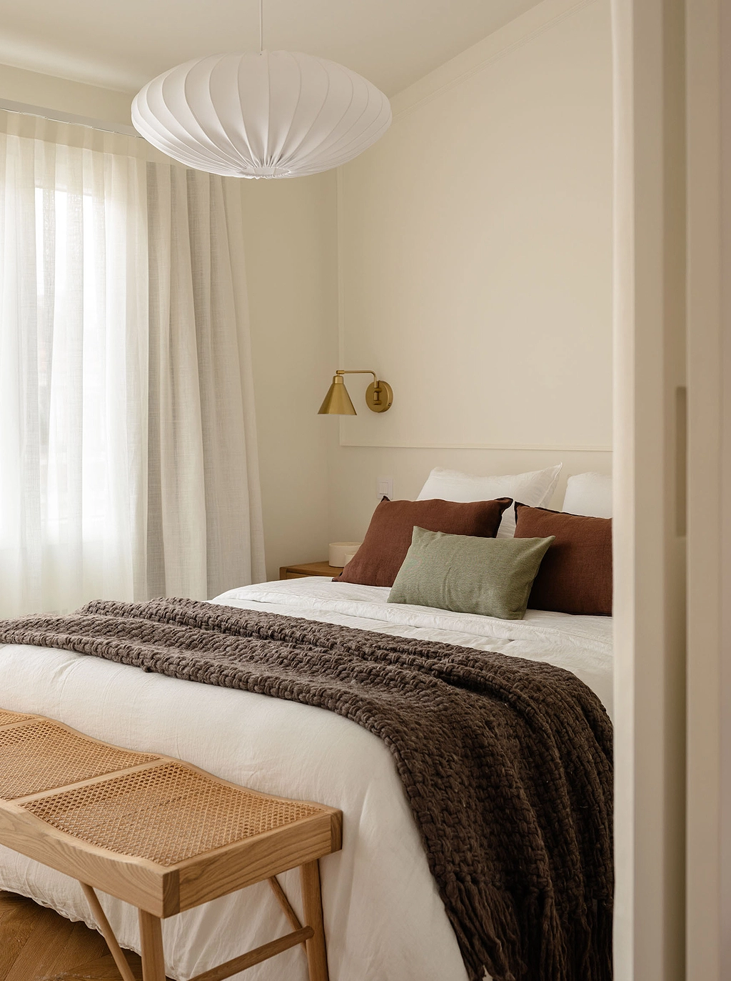 El dormitorio, con su apacible combinación de textiles en lino y toques de color, completa la atmósfera relajante de este apartamento.