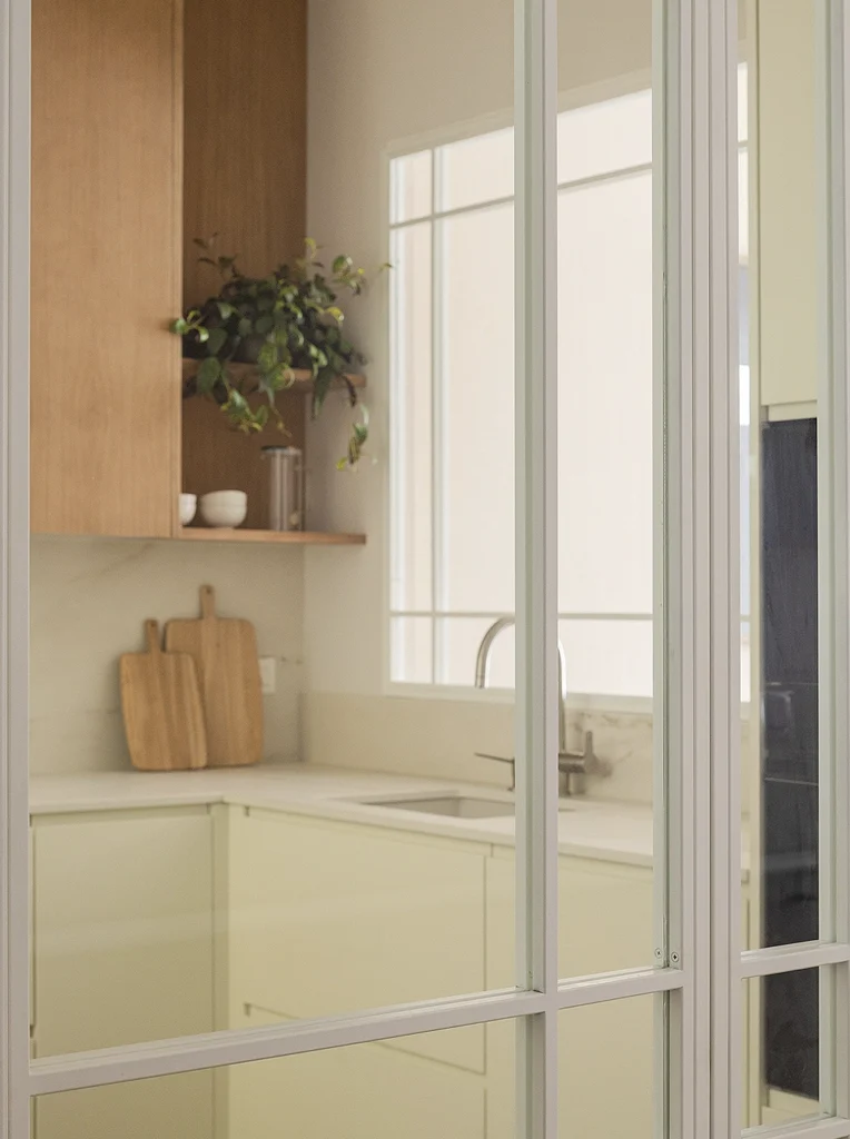 La cocina, en forma de U, cuenta con una gran cristalera que permite el paso de luz natural a la vez que la conecta visualmente con el comedor. De esa manera se establece una comunicación fluida entre ambas áreas, manteniendo la sensación de apertura sin perder la funcionalidad de la cocina cerrada.