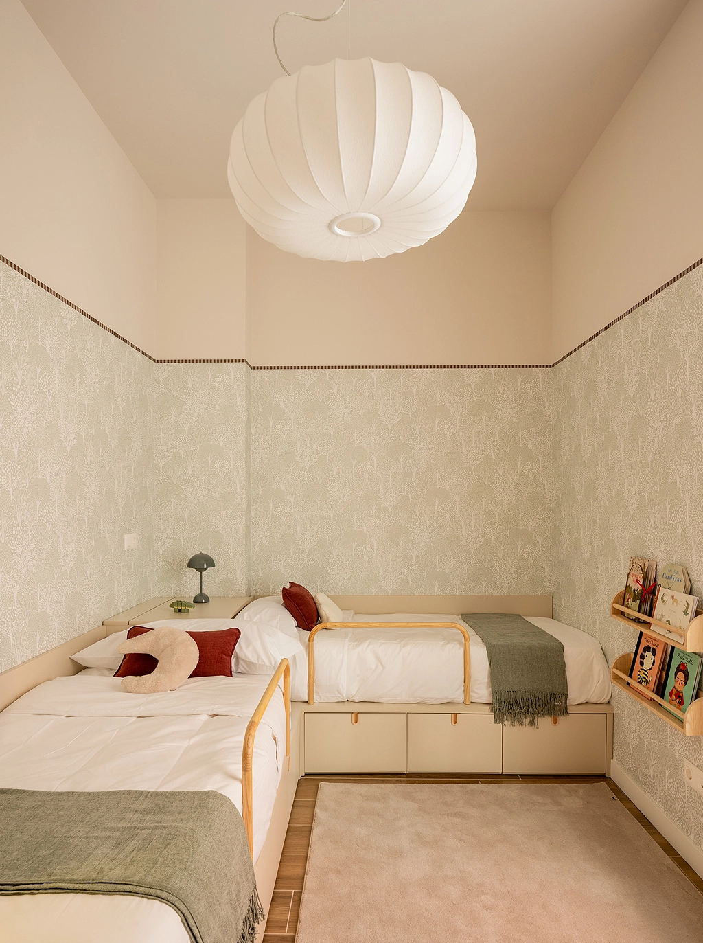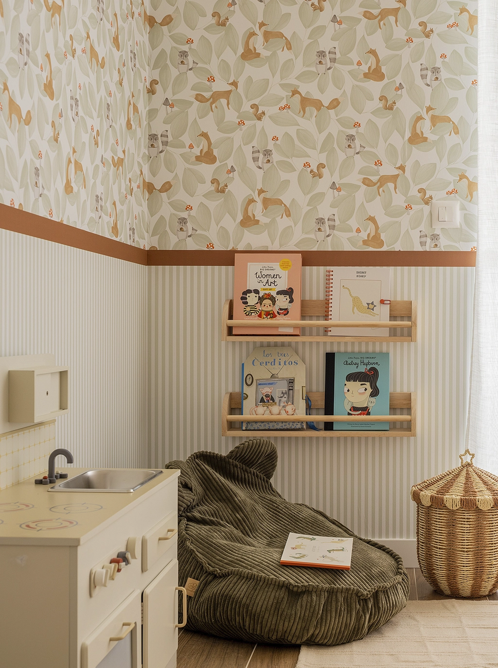 La sala de juegos rompe con la neutralidad general, dando paso a una estancia llena de color y creatividad. Las paredes se animan con el papel pintado y el mobiliario adquieren formas divertidas. Todo está pensado para inspirar al juego, a la imaginación y la alegría sin perder el buen gusto ni la coherencia con el resto del hogar.