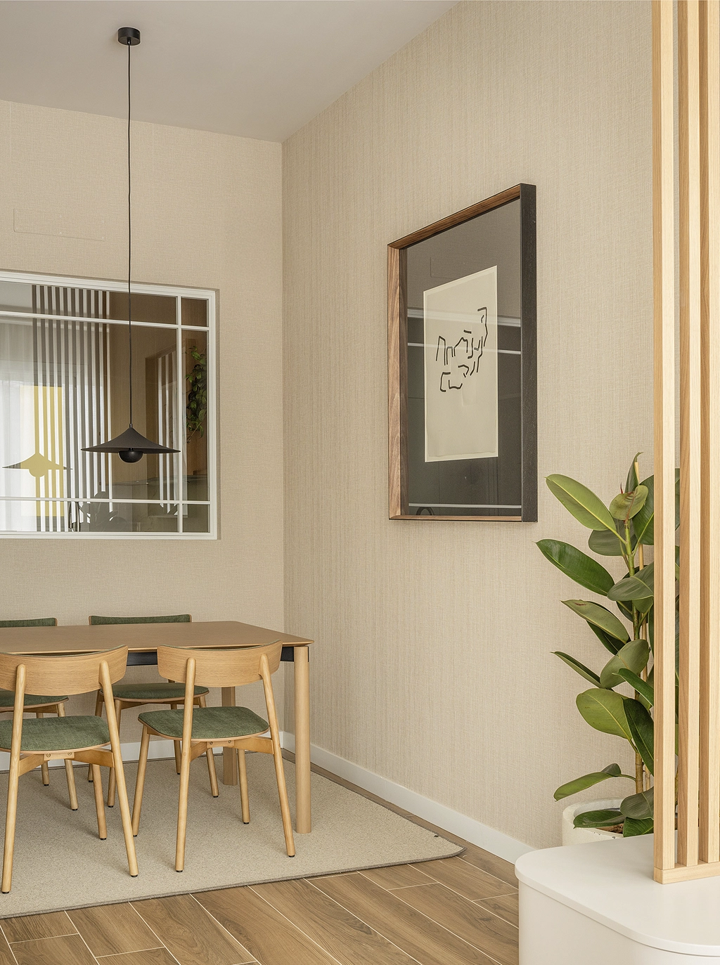 La cocina, en forma de U, cuenta con una gran cristalera que permite el paso de luz natural a la vez que la conecta visualmente con el comedor. De esa manera se establece una comunicación fluida entre ambas áreas, manteniendo la sensación de apertura sin perder la funcionalidad de la cocina cerrada.